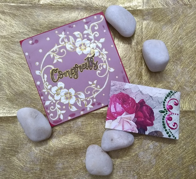 This time the crazy me overpowered the logical me and I ended up doing 2 cards with the same stencil and an Origami Gift envelope. (Had no patience for the glue to dry. Took the pic immediately after I finished the card)... 😁